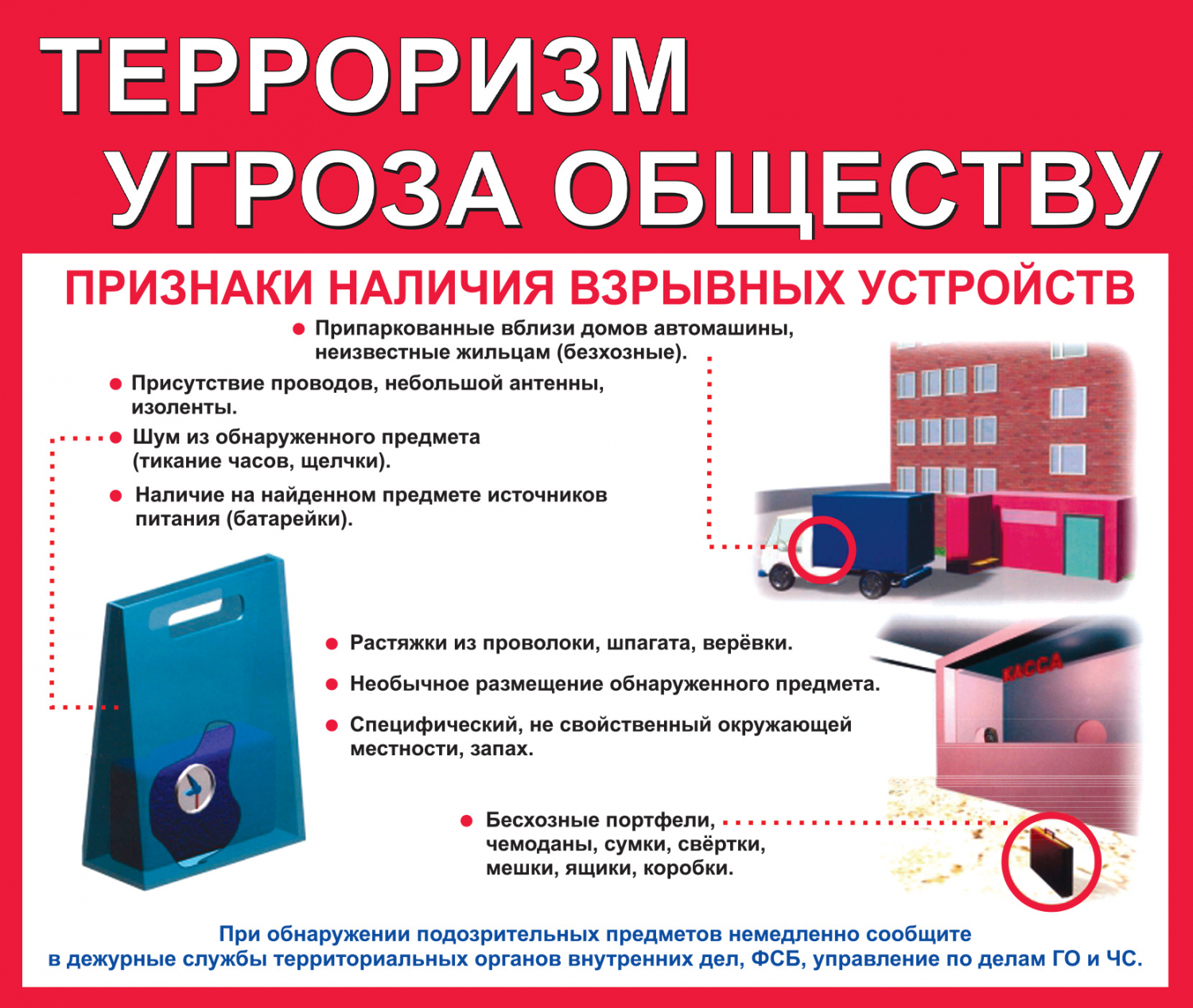 ПОМНИТЕ! Террористические группы могут установить взрывные устройства на объекте в самых неожиданных местах (в подвалах строящегося здания, в местах массового скопления людей, трансформаторных будках, в припаркованных машинах, на рабочих местах т.д.).