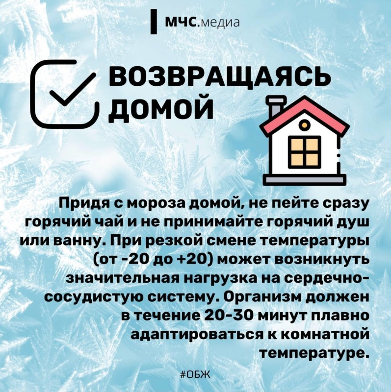 Если мороз всё же застал вас вне помещения, самое главное – вовремя заметить первые признаки переохлаждения или обморожения. Тревожными сигналами для Вас должны послужить дрожь, апатия, потеря чувствительности, бледная, холодная на ощупь кожа, зуд, онемение, ощущение покалывания. В этом случае Вы должны постараться как можно быстрее добраться до теплого помещения, выпить горячего чая. Можно зайти в магазин или подъезд любого попавшегося дома.